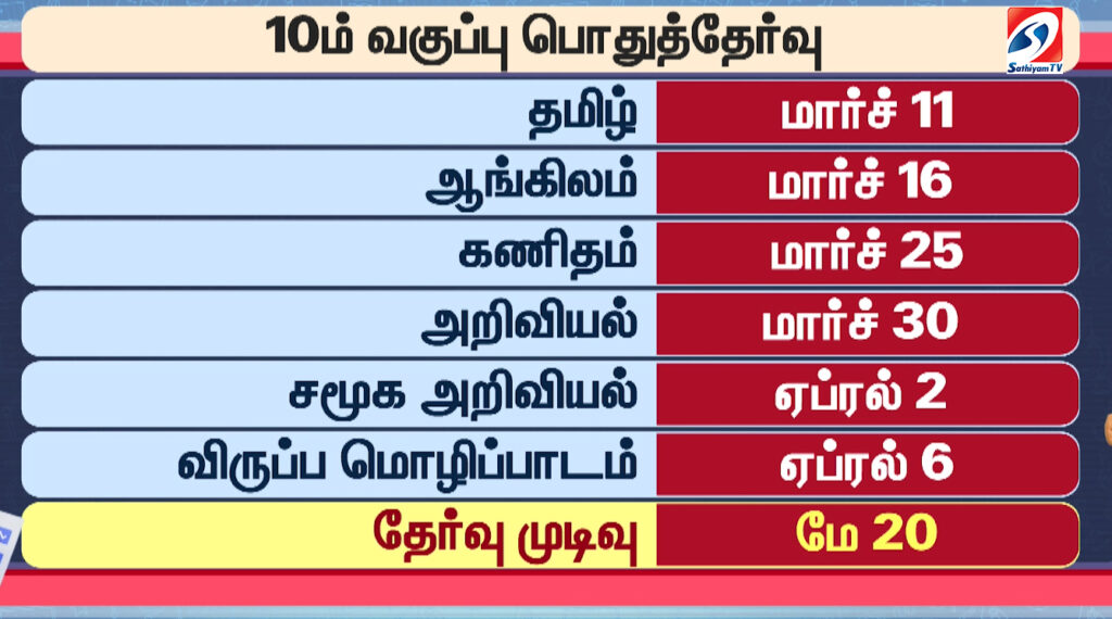 அதாவது, பத்தாம் வகுப்பு பொதுத்தேர்வு மார்ச் 11-ம் தேதி தொடங்கி ஏப்ரல் 6-ந்தேதி வரை நடைபெறும். இந்த பொதுத்தேர்வை 8.70 லட்சம் மாணவர்கள் 10-ம் வகுப்பு எழுத உள்ளனர்.