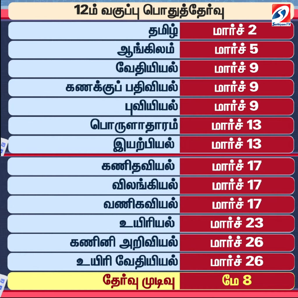 அதே போல, பன்னிரண்டாம் வகுப்பு பொதுத்தேர்வு மார்ச் 2-ந்தேதி தொடங்கி மார்ச் 26-ந்தேதி வரை நடைபெறுகிறது. மேலும், பன்னிரண்டாம் வகுப்பு பொதுத்தேர்வு 8.7 லட்சம் மாணவர்கள் எழுத உள்ளனர்.