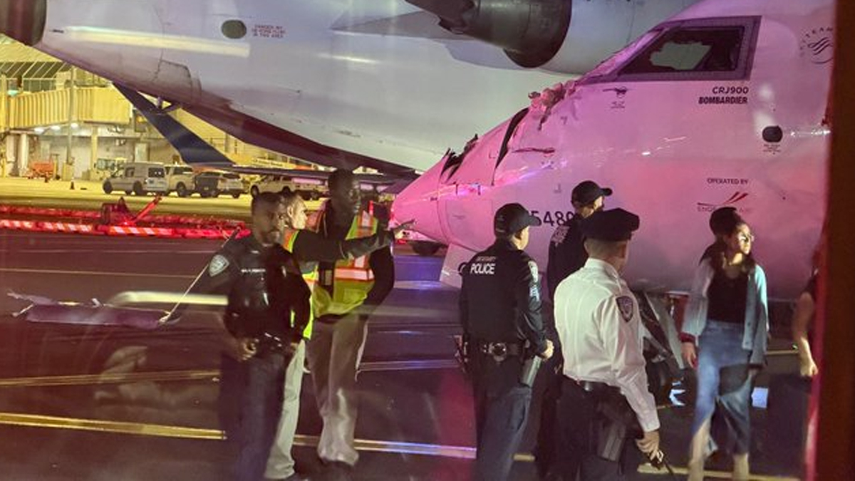 நியூயார்க் லாகார்டியா விமான நிலையத்தில் புதன்கிழமை இரவு டெல்டா ஏர்லைன்ஸ் வர்த்தக விமானங்கள் மோதியது. இதில் ஒரு விமானத்தின் இறக்கை துண்டிக்கப்பட்டது.