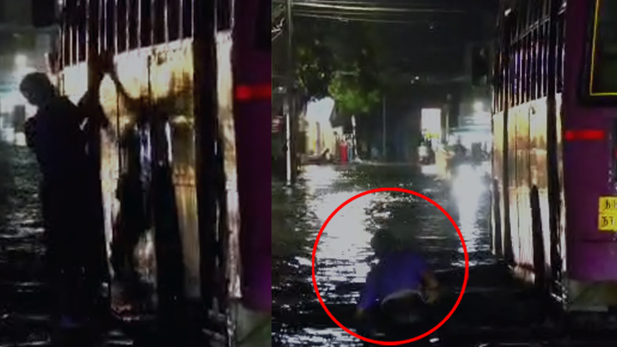 பேருந்தில் இருந்த அரசு பேருந்து நடத்தினர் போதை ஆசாமியை எட்டி உதைத்தார். இதில் நிலை தடுமாறி பேருந்தில் இருந்து அவர் சாக்கடை கலந்த மழை நீரில் கீழே விழுந்தார். தொடர்ந்து தத்தளித்த அவர் அங்கிருந்து சென்றார்.