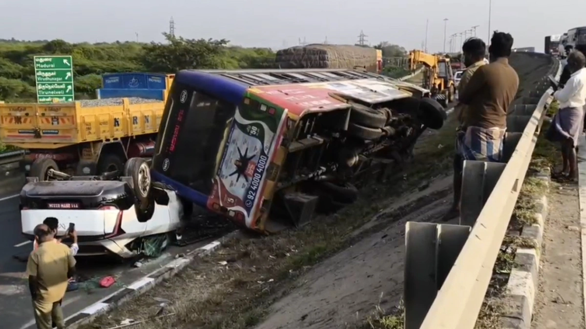 கோயம்புத்தூரில் இருந்து மதுரை நோக்கி அரசு பேருந்து ஒன்று இன்று வந்து கொண்டிருந்தது. இந்த பேருந்து, மதுரை மாவட்டம், சமயநல்லூர் ரயில்வே மேம்பாலம் அருகே வந்தபோது, முன்னால் சென்று கொண்டிருந்த எலக்ட்ரிக் கார் ஒன்றை முந்திச் செல்ல பேருந்து ஓட்டுநர் முயன்றுள்ளார்.