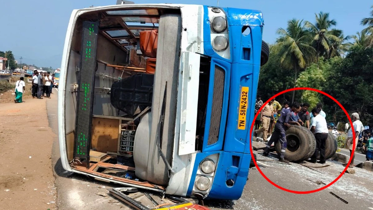 மதுரையில் டயர் வெடித்து நடுரோட்டில் கவிழ்ந்த அரசு பேருந்து