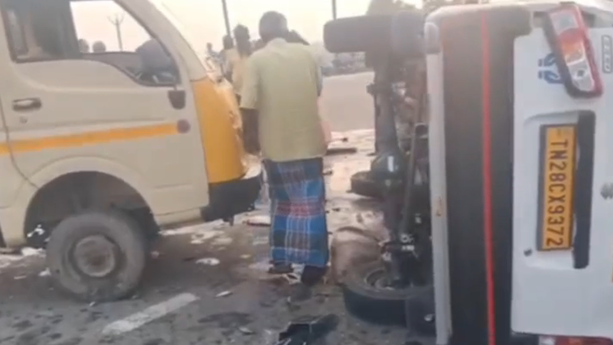 திண்டுக்கல் மாவட்டம், வேடசந்தூர் அருகே, சேலத்தை நோக்கி ஆம்புலன்ஸ் வாகனம் ஒன்று சென்று கொண்டிருந்தது. அப்போது ஆம்புலன்ஸ் மீது அடையாளம் தெரியாத லாரி மோதியது. இதனால் முன்னாள் சென்று கொண்டிருந்த வாகனம் மீது ஆம்புலன்ஸ் மோதியது.