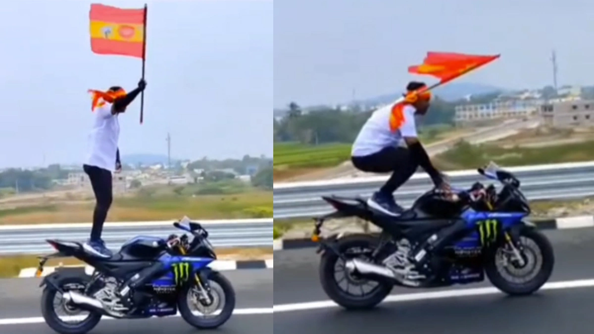 இந்நிலையில் கடந்த சில நாட்களுக்கு முன் சென்னை – பெங்களூர் அதிவிரைவு சாலையில் தலையில் தவெக துண்டு மற்றும் கையில் தவெக கொடியுடன் சாலையில் பெட்ரோலை ஊற்றி தீ பற்ற வைத்தும், வாயில் இருந்து ஊதி நெருப்பு பற்ற வைத்தும், தவெக கொடியை ஏந்தியவாறு அதிவேக பைக் சாகசத்தில் ஈடுபட்டு அதை வீடியோ ரீல்ஸ்சாக பதிவேற்றம் செய்துள்ளார்.