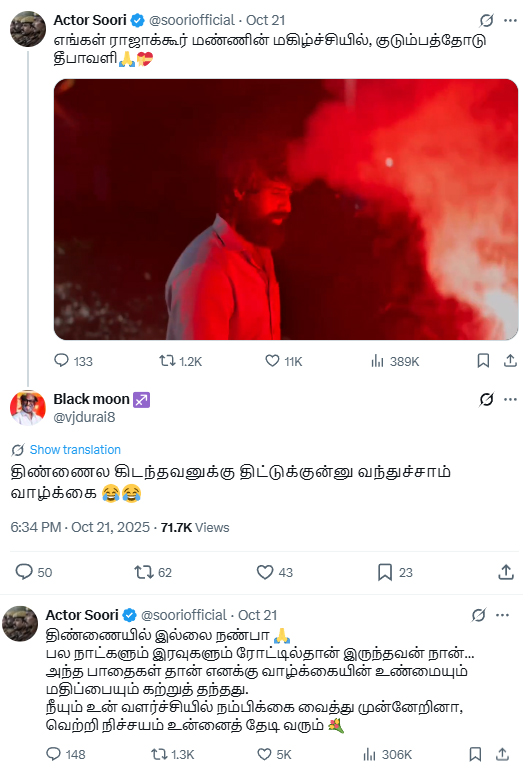 தனது குடும்பத்துடன் தீபாவளி கொண்டாடிய வீடியோவை சூரி தனது எக்ஸ் பக்கத்தில் பகிர்ந்திருந்தார். இந்த பதிவில் ஒருவர், “திண்ணைல கிடந்தவனுக்கு திட்டுக்குன்னு வந்துச்சாம் வாழ்க்கை” என்று கிண்டல் அடித்திருந்தார்.