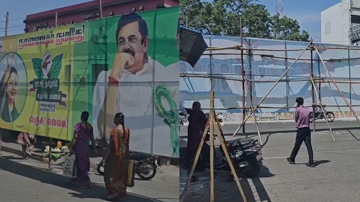 பேருந்து நிலையத்தை மறைத்து வைக்கப்பட்ட அதிமுக பேனர் : பயணிகள் அவதி