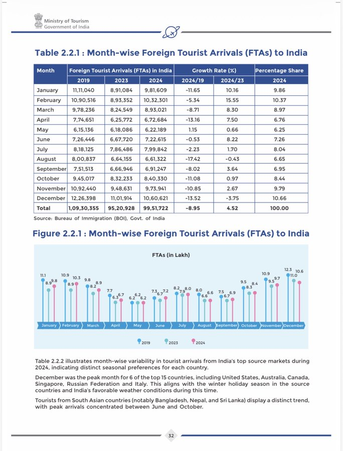இந்திய சுற்றுலா அமைச்சகம் வெளியிட்டுள்ள 2025-ம் ஆண்டு ஆண்டறிக்கையின்படி 2024-ம் ஆண்டு இந்தியாவிற்கு வந்த வெளிநாட்டு சுற்றுலா பயணிகளின் எண்ணிக்கை 99,51,722. அதேபோல உள்துறை அமைச்சகத்திற்கான நாடாளுமன்ற நிலைக்குழு 16-03-2026 அன்று மாநிலங்களவையில் தன்னுடைய அறிக்கையை சமர்ப்பித்துள்ளது.