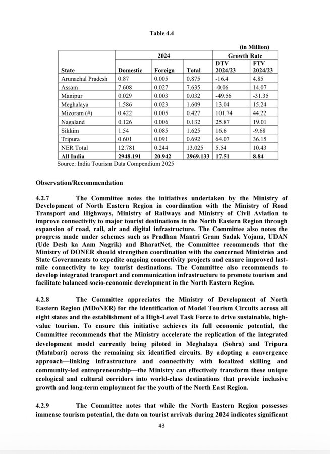 அதில், வடகிழக்கு மாநிலங்களுக்கு வந்த வெளிநாட்டு சுற்றுலா பயணிகள் குறித்த எண்ணிக்கை விபரங்கள் குறிப்பிடப்பட்டுள்ளது. அதன்படி, வடகிழக்கு மாநிலங்கள் மற்றும் சிக்கிம் உட்பட பிரதேசங்களுக்கு 2024-ம் ஆண்டில் 2.44 லட்சம் வெளிநாட்டவர் வந்து சென்றுள்ளதாக கூறப்பட்டுள்ளது. அதில்,தற்போது சர்ச்சைக்கு உள்ளாகியிருக்கும் மிஸோரம் மாநிலத்திற்கு 5 ஆயிரம் வெளிநாட்டவர் பயணித்துள்ளனர்.