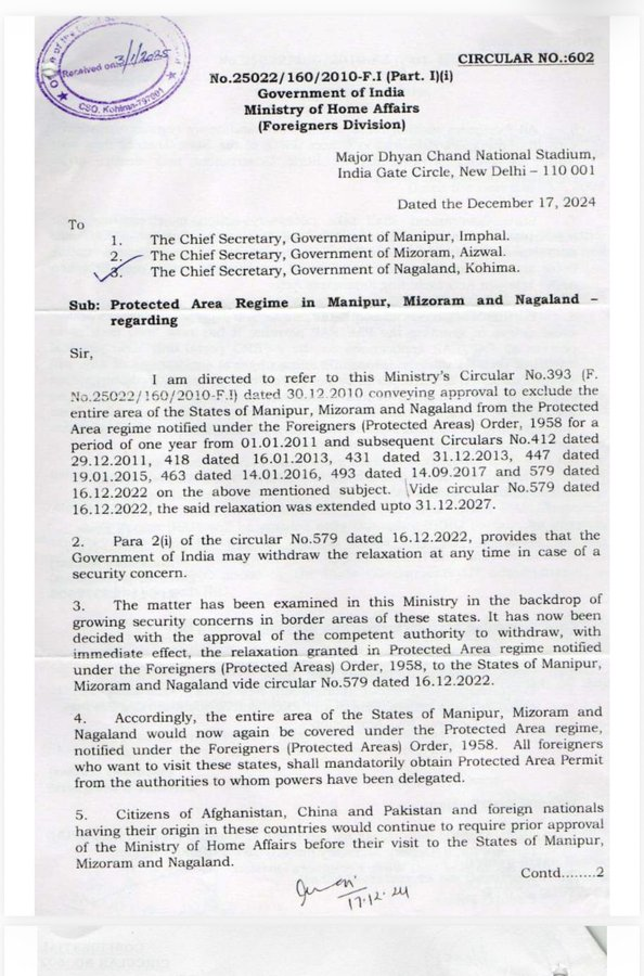 17-04-2024 அன்று உள்துறை அமைச்சகத்தின் Foreigners Division சார்பில் மணிப்பூர்,மிசோரம் மற்றும் நாகலாந்து மாநிலங்களின் தலைமைச்செயலாளர்களுக்கு Circular No-602-ன் மூலமாக நினைவூட்டல் கடிதம் எழுதப்பட்டுள்ளது.