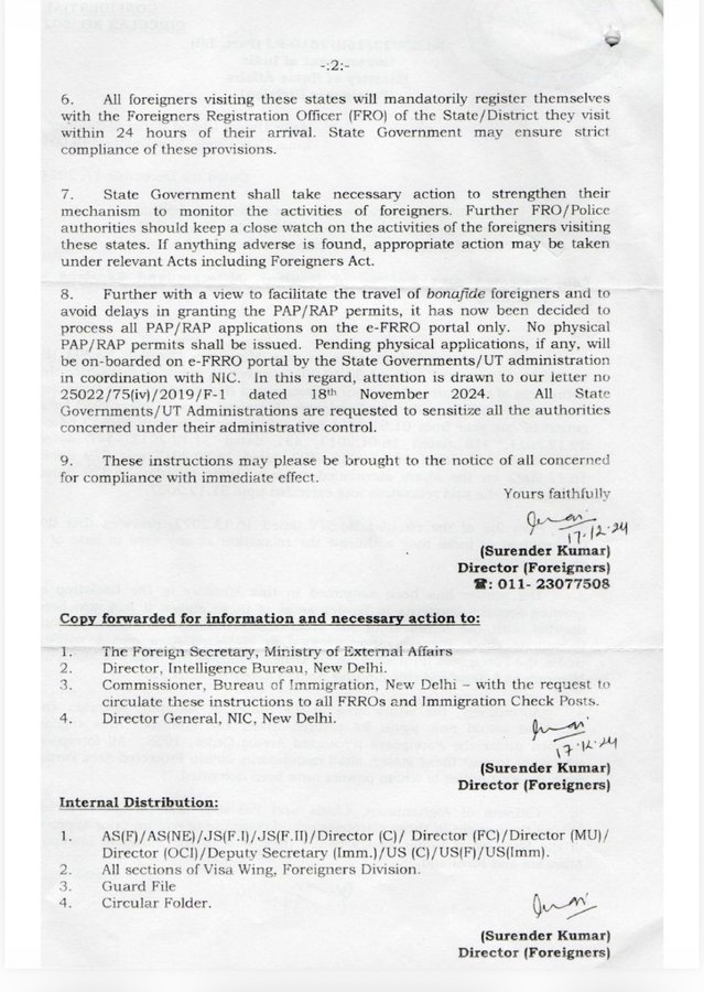 சீனா,பாகிஸ்தான் மற்றும் ஆப்கான் ஆகிய 3 நாடுகளைச்சேர்த்தவர்கள் மட்டும் கட்டாயம் உள்துறை அமைச்சகத்திடம் அனுமதி பெறவேண்டும். இதர நாட்டவர்கள் Foreigners Registration Office-ல் அனுமதி பெற்று பயணிக்கலாம் என்று உள்துறை அமைச்சகத்தின் Foreigners Division ,16-12-2022 அன்று Circular No-579 ல் கூறியுள்ளது. இந்த உத்தரவு 2027 ம் ஆண்டுவரை அமுலில் இருக்கும் என்றும் உள்துறை அமைச்சகத்தின் சுற்றறிக்கை கூறுகிறது.