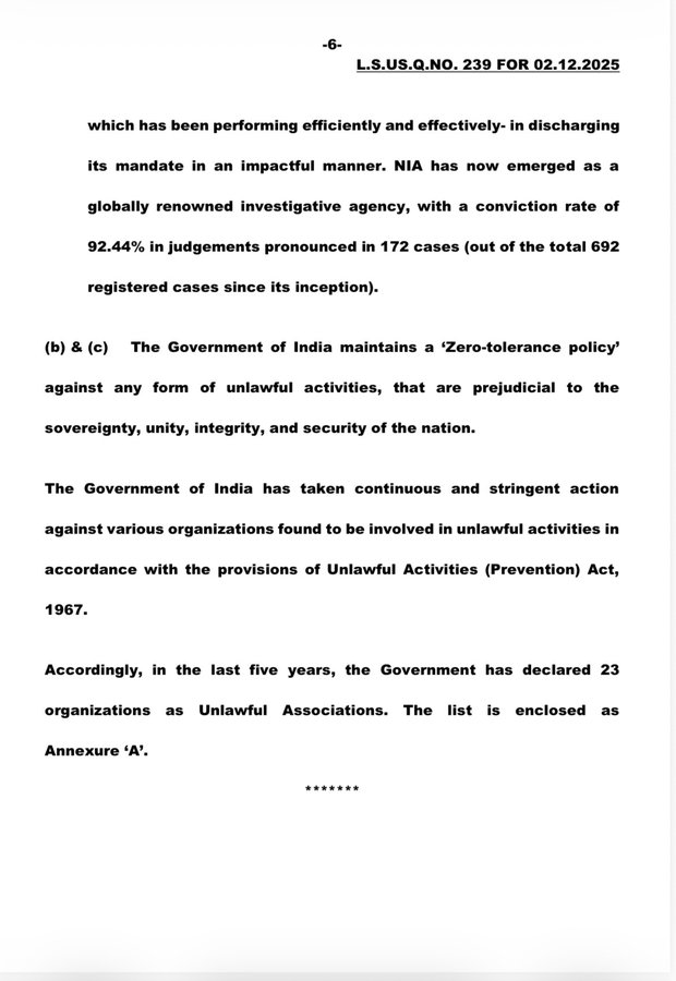 02-12-2025 அன்று மக்களவையில் உள்துறை அமைச்சகம் கூறியுள்ள பதிலின்படி, இந்தியாவில் தேசிய புலனாய்வு முகமை தொடங்கப்பட்டதிலிருந்து பதிவு செய்யப்பட்ட வழக்குகள் மொத்தம் 692 வழக்குகள். அதில் 172 வழக்குகளில் தீர்ப்பு வழங்கப்பட்டுள்ளது. குற்ற நிரூபண சதவிகிதம் 92.44% என்கிறது உள்துறை அமைச்சகம்.
