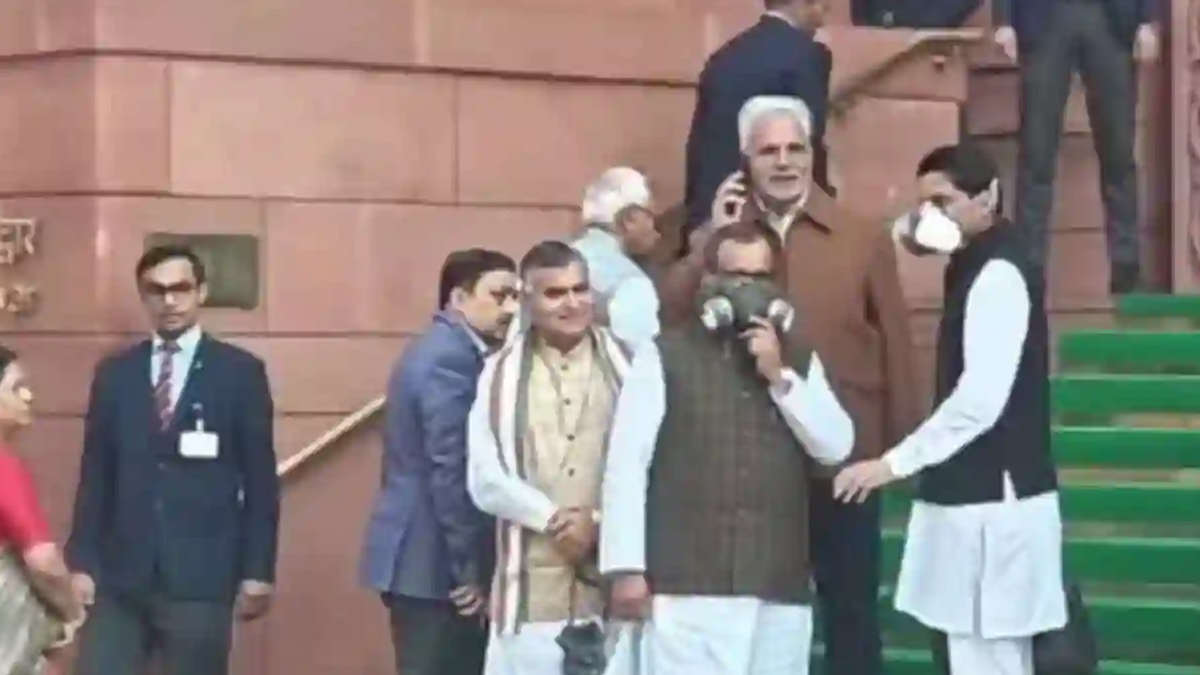 டெல்லி காற்று மாசுபாட்டை தடுக்க நடவடிக்கை எடுக்கக் கோரி நாடாளுமன்ற வளாகத்தில் எதிர்க்கட்சி எம்பிக்கள் முகக்கவசம் அணிந்து ஆர்ப்பாட்டத்தில் ஈடுபட்டனர்.