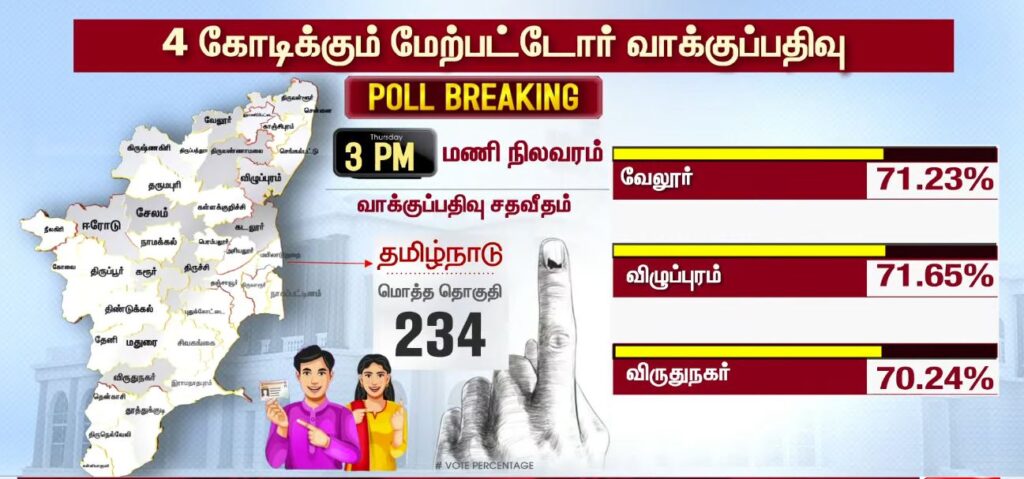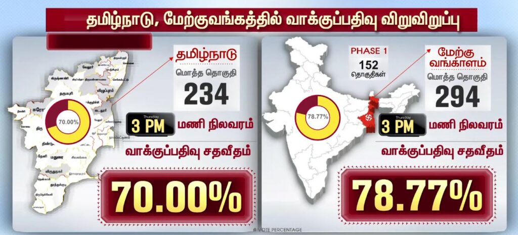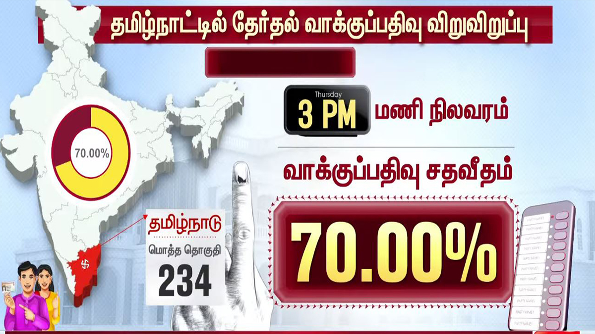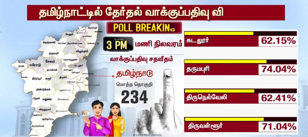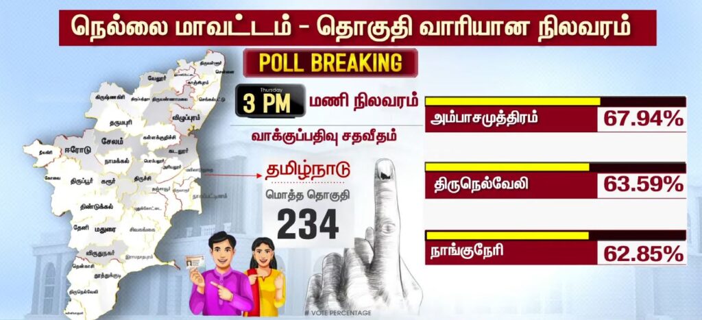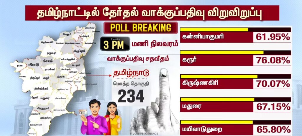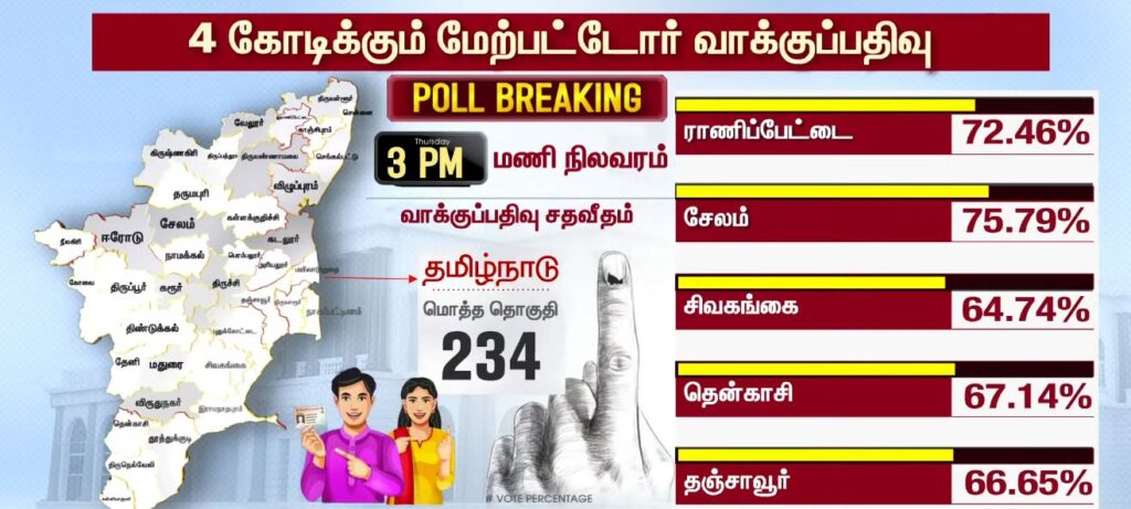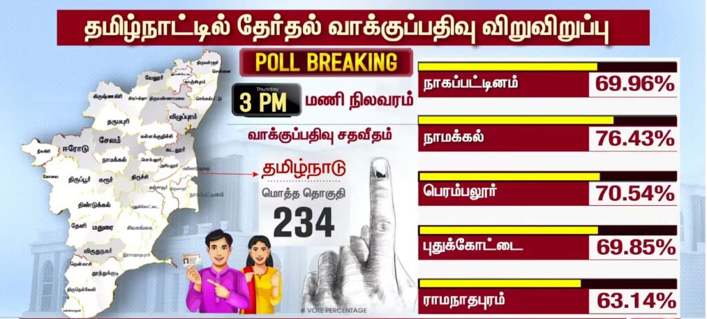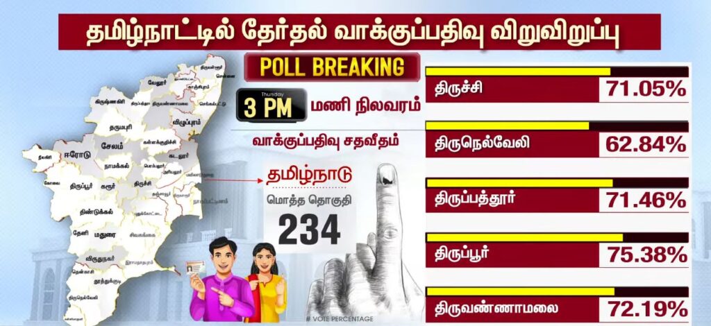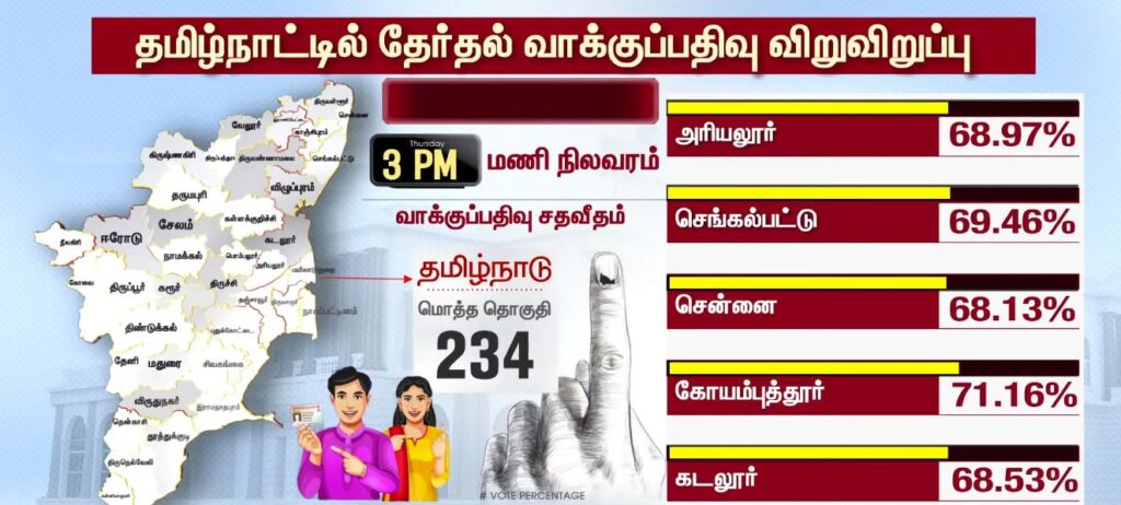 03 மணியளவில் மாவட்ட வாரியாக வாக்குப்பதிவு சதவீதம்!!TamilnaduApril 23, 2026Updated: April 23, 2026 தமிழ்நாட்டில் உள்ள 234 தொகுதிகளிலும் இன்று காலை 7 மணிக்கு வாக்குப்பதிவு தொடங்கியது. பொதுமக்கள், தலைவர்கள் மற்றும் நட்சத்திரங்கள் வாக்களித்து வருகின்றனர். மேலும், மாவட்ட வாரியாக வாக்குப்பதிவு சதவீதம் வெளியாகியுள்ளது.ShareFacebookXPinterestWhatsApp Related News2026-ல் வெல்லப்போவது யார்..? – 2021 Vs 2026.. Sathiyam tv - April 23, 2026 அதிக வாக்குகள் பதிவான TOP 5 மாவட்டங்கள்… Sathiyam tv - April 23, 2026 எஸ்.ஏ.சந்திரசேகர், ஷோபா சந்திரசேகர் வாக்களிப்பு!! Sathiyam tv - April 23, 2026 Latest News05 மணியளவில் மாவட்ட வாரியாக வாக்குப்பதிவு சதவீதம்!! Sathiyam tv - April 23, 2026 ஜனநாயக கடமை ஆற்றிய திரை பிரபலங்கள் Clicks Sathiyam tv - April 23, 2026 புதிய வரலாற்றை நோக்கி தமிழ்நாடு 2026 வாக்குப்பதிவு… என்ன தெரியுமா? Sathiyam tv - April 23, 2026