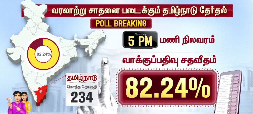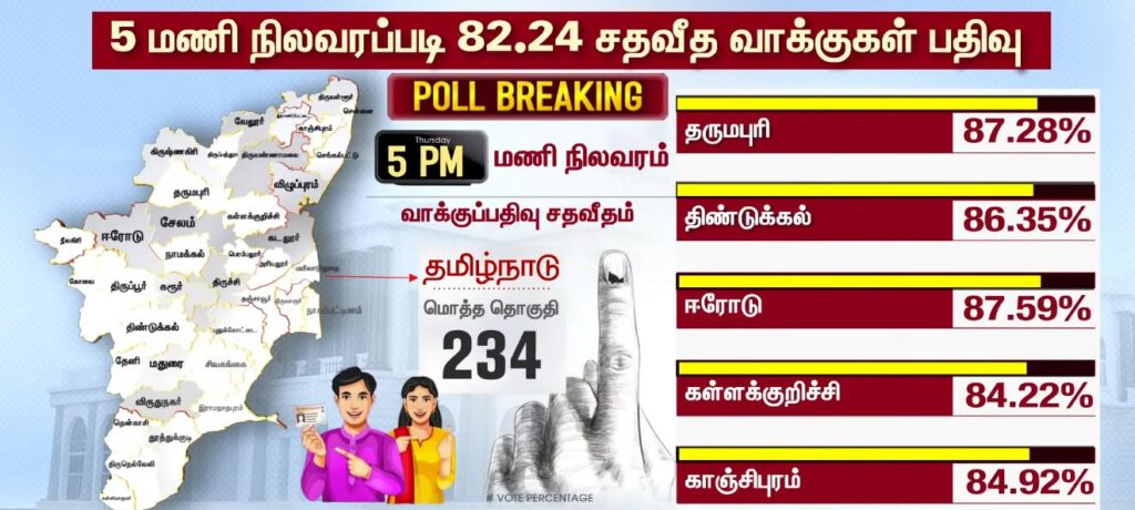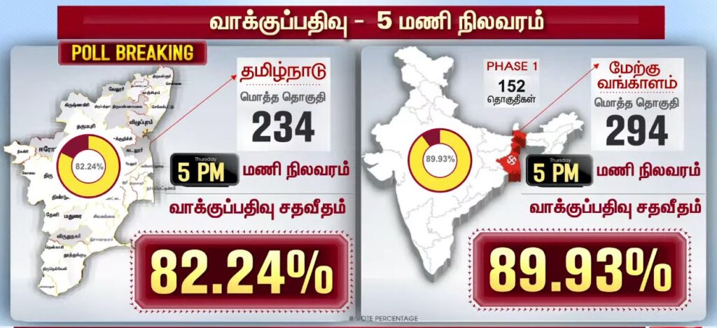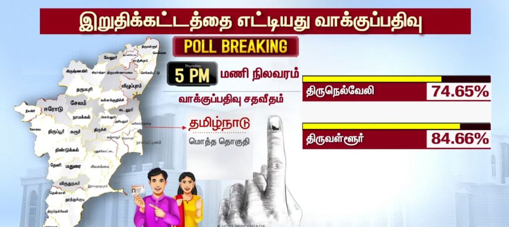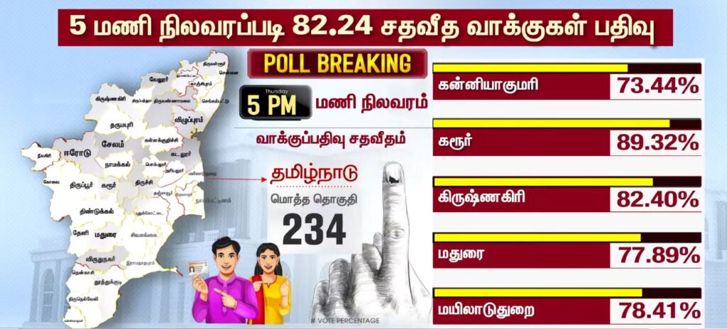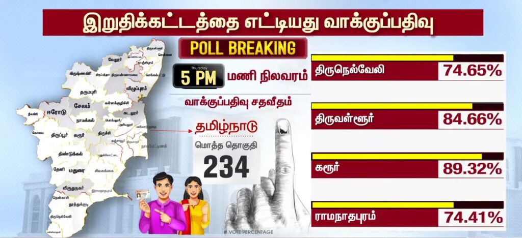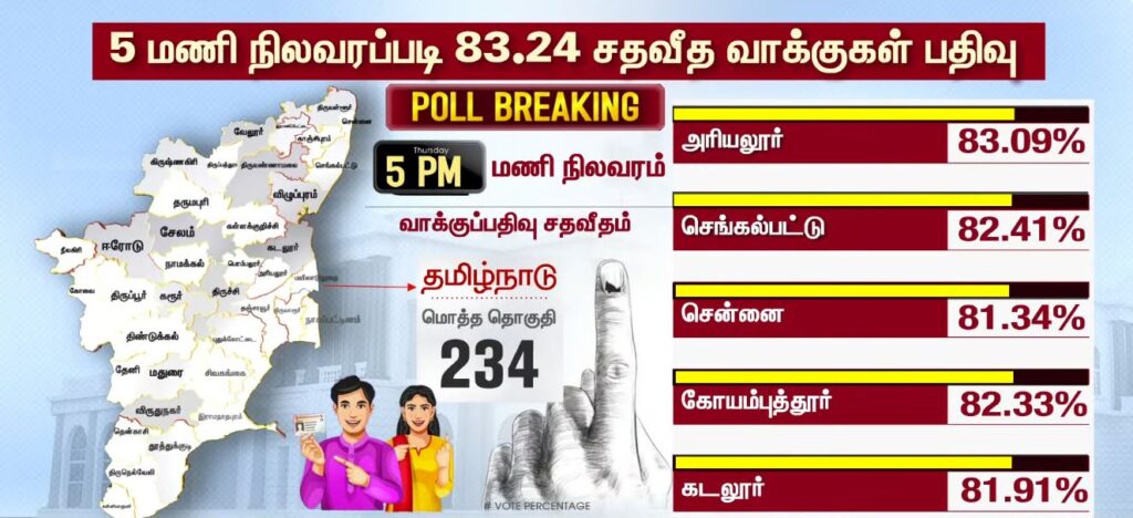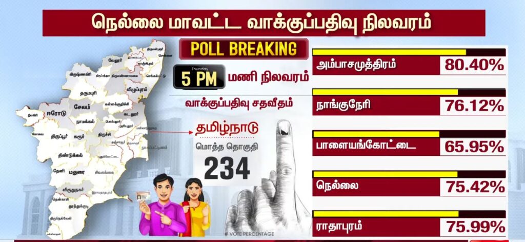 05 மணியளவில் மாவட்ட வாரியாக வாக்குப்பதிவு சதவீதம்!!PoliticsApril 23, 2026Updated: April 23, 2026 தமிழ்நாட்டில் உள்ள 234 தொகுதிகளிலும் இன்று காலை 7 மணிக்கு வாக்குப்பதிவு தொடங்கியது. பொதுமக்கள், தலைவர்கள் மற்றும் நட்சத்திரங்கள் வாக்களித்து வருகின்றனர். மேலும், மாவட்ட வாரியாக வாக்குப்பதிவு சதவீதம் வெளியாகியுள்ளது.ShareFacebookXPinterestWhatsApp Related Newsபுதிய வரலாற்றை நோக்கி தமிழ்நாடு 2026 வாக்குப்பதிவு… என்ன தெரியுமா? Sathiyam tv - April 23, 2026 தேர்தல் முடிவுகளுக்கு பின் நடிகர் விஜய்யுடன் கூட்டணி? பாஜக தேசிய தலைவர் பற்றவைத்த பரபரப்பு! Sathiyam tv - April 23, 2026 100 சதவீதம் நம்பிக்கை… வெற்றி உறுதி… எடப்பாடி பழனிசாமி பேட்டி.. Sathiyam tv - April 23, 2026 Latest Newsஇந்தியா வந்த கப்பல் மீது சரமாரி குண்டுவீச்சு! ஈரான் நடத்திய அதிரடி துப்பாக்கிச்சூடு! Sathiyam tv - April 23, 2026 சட்டமன்ற தேர்தல்; கூடுதல் நேரம்… அவசர அறிவிப்பு… Sathiyam tv - April 23, 2026 ஜனநாயக கடமை ஆற்றிய திரை பிரபலங்கள் Clicks Sathiyam tv - April 23, 2026