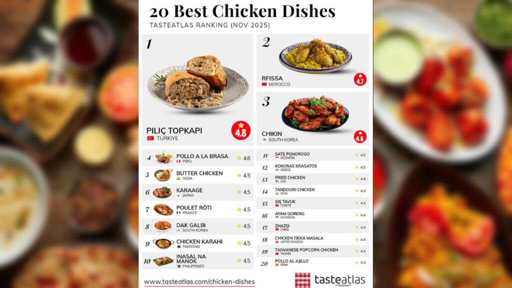 மேலும், ‘உலகின் 20 சிறந்த சிக்கன் உணவுகள்’ என்ற தலைப்பிலான பட்டியலில் துருக்கியின் பிலிக் டோப்காபி முதலிடத்திலும், மொராக்கோவைச் சேர்ந்த ரிஃபிசா மற்றும் தென் கொரியாவைச் சேர்ந்த சிக்கின் மற்றும் கொரிய வறுத்த சிக்கன் ஆகியவை 2-வது இடத்திலும் உள்ளன.
