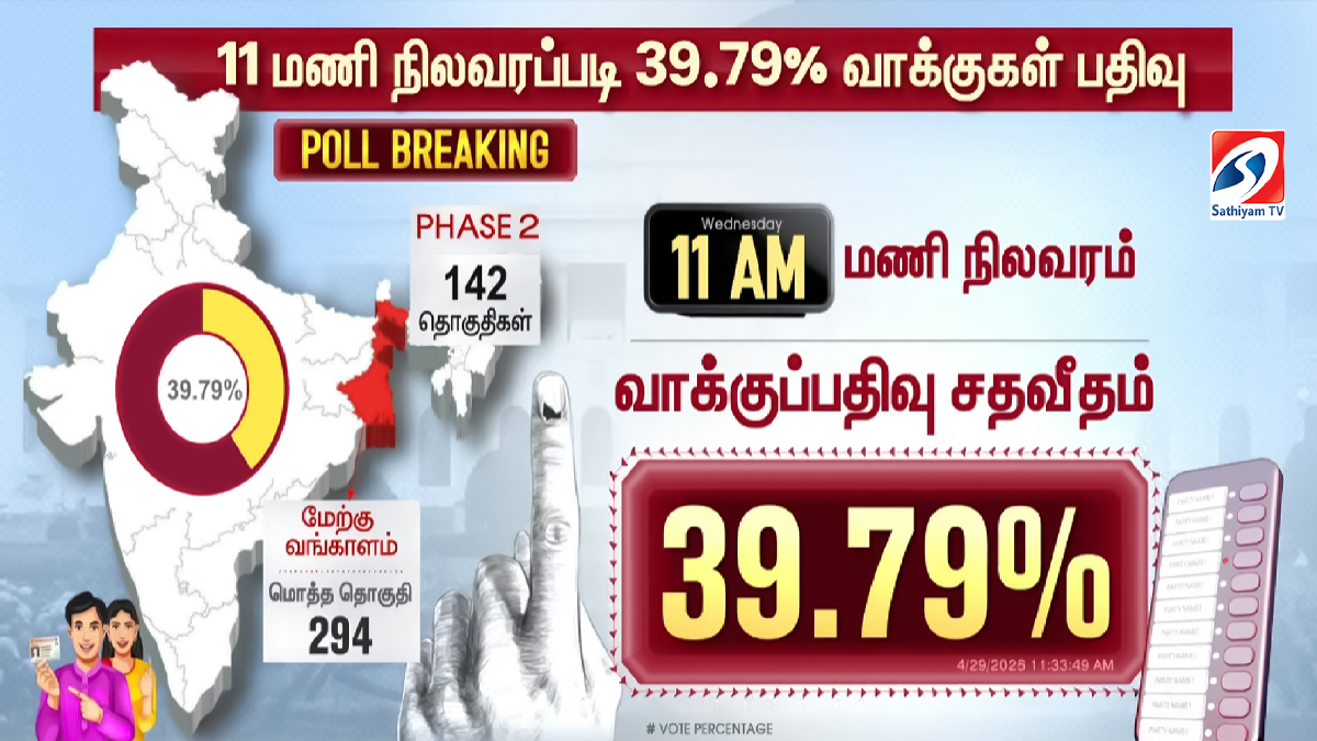 மேற்குவங்க 2-வது கட்ட தேர்தல் – காலை 11 மணி நிலவரம்PoliticsApril 29, 2026Updated: April 29, 2026 ShareFacebookXPinterestWhatsApp Related Newsஅள்ளிக்குவித்த வாக்குப்பதிவுக்கு தவெக தான் காரணமா? வெளிச்சத்துக்கு வந்த உண்மை இதுதான்! Sathiyam tv - April 24, 2026 05 மணியளவில் மாவட்ட வாரியாக வாக்குப்பதிவு சதவீதம்!! Sathiyam tv - April 23, 2026 புதிய வரலாற்றை நோக்கி தமிழ்நாடு 2026 வாக்குப்பதிவு… என்ன தெரியுமா? Sathiyam tv - April 23, 2026 Latest News109 பேரை பலி வாங்கிய “HEAT STROKE” – வெளியே வராதீர்கள்! Sathiyam tv - April 29, 2026 அமெரிக்காவின் ஒரே ‘ஸ்பெஷல்’ நாடு இஸ்ரேல்தான்! வெடித்தது புதிய சர்ச்சை! Sathiyam tv - April 29, 2026 ஆதார் கார்டு வைத்திருப்பவர்கள் கவனத்திற்கு! உடனே ‘இதை’ update பண்ணுங்க! Sathiyam tv - April 29, 2026