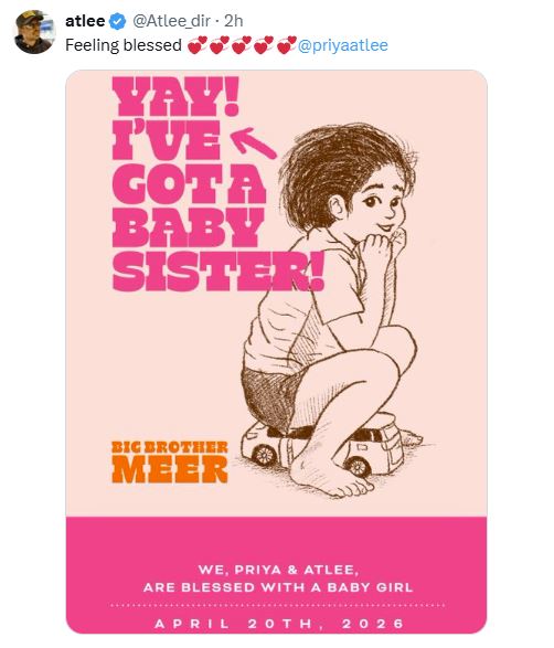 இந்த நிலையில், அட்லீ–ப்ரியா தம்பதிக்கு இரண்டாவது குழந்தையாக பெண் குழந்தை பிறந்துள்ளதாக தகவல் வெளியாகியுள்ளது. 2014ஆம் ஆண்டு பிரியாவை திருமணம் செய்துகொண்ட அட்லீக்கு, ஏற்கனவே ‘மீர்’ என்ற ஆண் குழந்தை உள்ளான். தற்போது பெண் குழந்தை பிறந்ததால் குடும்பத்தில் மகிழ்ச்சி நிலவுகிறது.