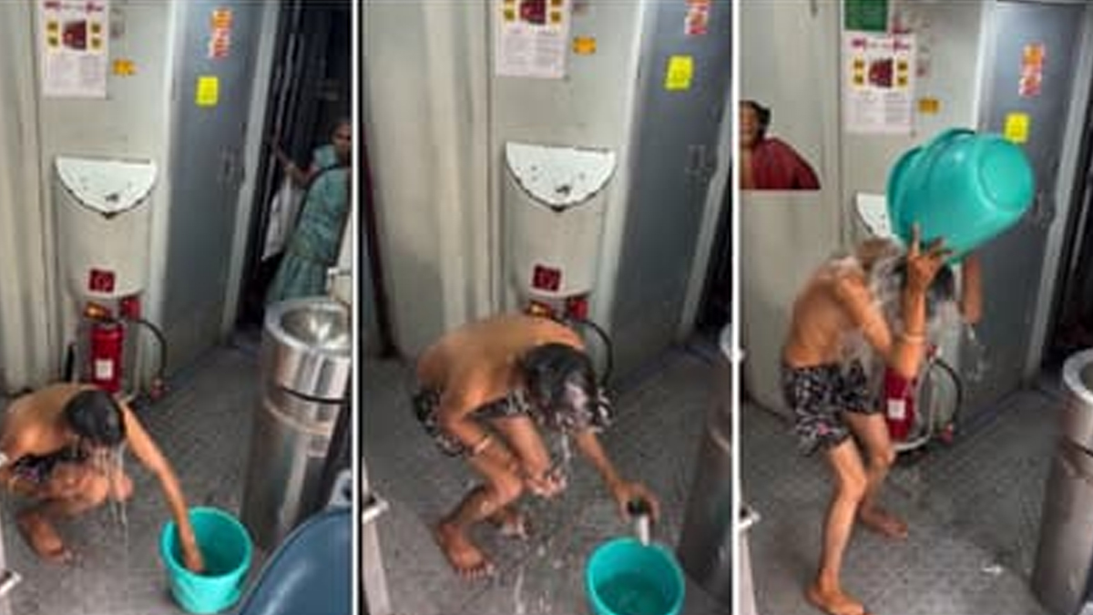 இந்நிலையில் ஓடும் ரயிலில் நபர் ஒருவர் பக்கெட்டில் வாளியில் தண்ணீர் கொண்டு வந்து கப்பில் எடுத்து தன்னுடைய தலையில் அள்ளி அள்ளி ஊற்றி குளிக்க ஆரம்பித்துவிட்டார். அதுமட்டுமல்ல, கையோடு கொண்டு வந்திருந்த சோப்பு, ஷாம்பு போட்டு குளிக்கிறார். இந்த குளியல் காட்சியை அவரே வீடுயோ எடுத்து, சோஷியல் மீடியாவில் பதிவிட்டுவிட்டார்.