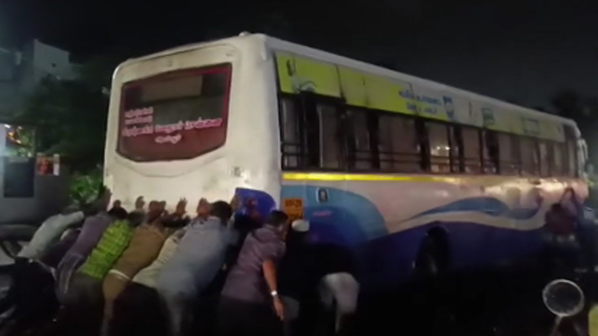 ராணிப்பேட்டையில் பழுதாகி நின்ற அரசு பேருந்தை மழைநீரில் இறங்கி தள்ளும் நிலைக்கு பயணிகள் தள்ளப்பட்டனர்.