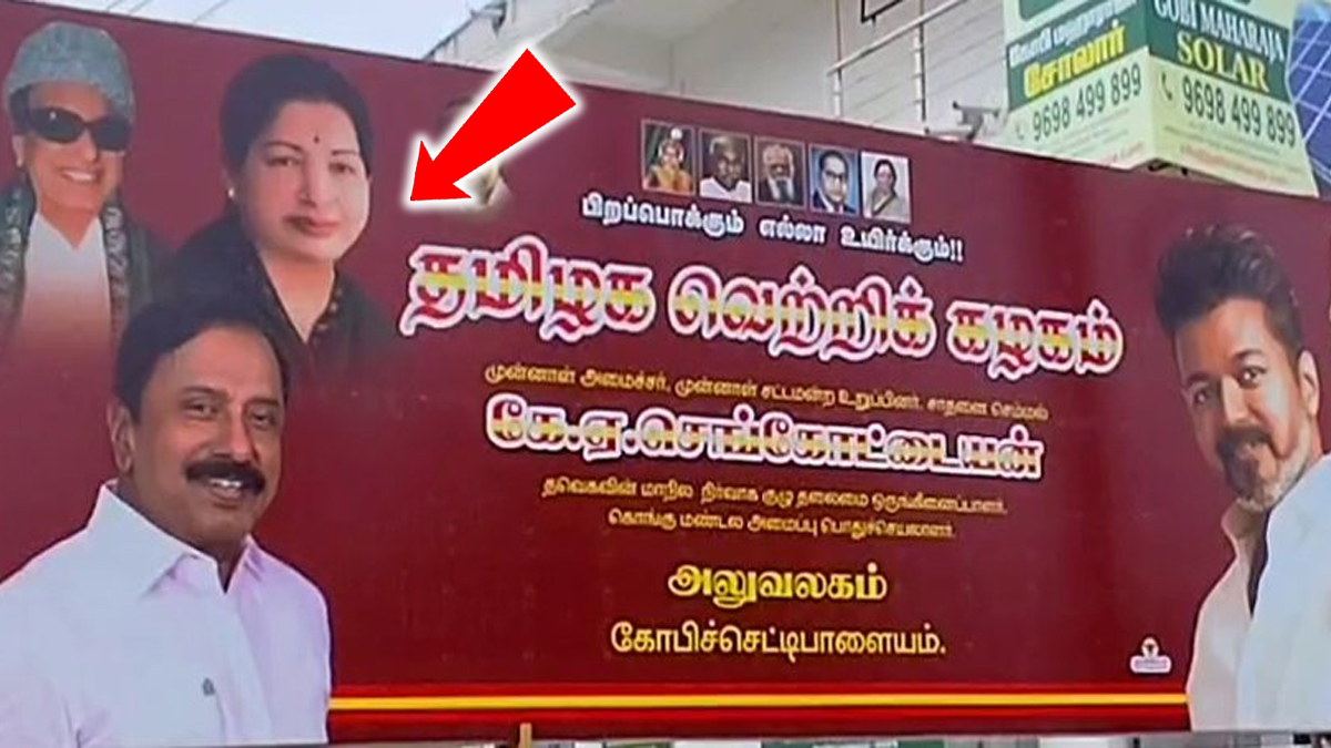 இந்த நிலையில், ஈரோடு மாவட்டம் கோபிச்செட்டிப்பாளையம் கரட்டூர் பகுதியில் உள்ள முன்னாள் அமைச்சர் செங்கோட்டையன் அலுவலகம் முன்பு வைத்திருந்த பிளக்ஸ் போர்டு புதிதாக மாற்றப்பட்டுள்ளது. மறைந்த முன்னாள் முதல்-அமைச்சர்கள் எம்.ஜி.ஆர், ஜெயலலிதா படங்களுடன் தமிழக வெற்றிக் கழக தலைவர் விஜய் இருப்பது போன்ற பிளக்ஸ் போர்டு வைக்கப்பட்டுள்ளது.