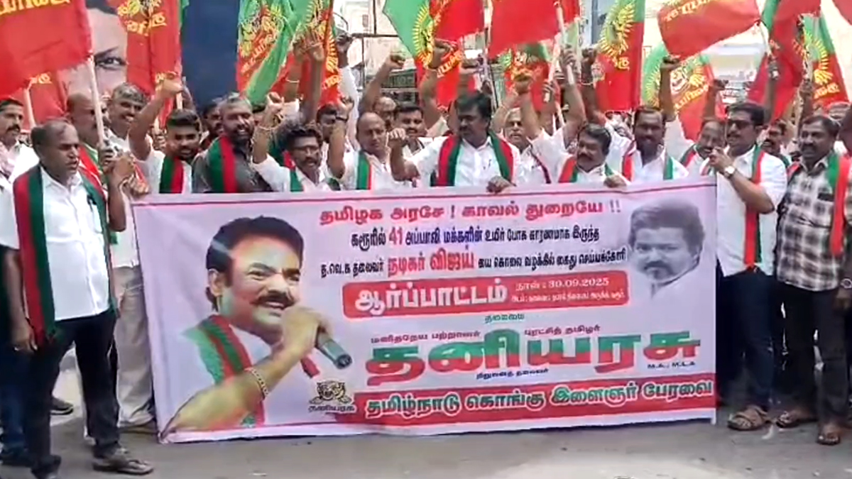 கரூர் மாவட்டத்தில் தவெக சார்பில் வேலுச்சாமி பறத்தில் கடந்த 27 ஆம் தேதி நடைபெற்ற கூட்டத்தில் 41 பேர் கூட்ட நெரிசலில் சிக்கி உயிரிழந்தனர். இதனை அடுத்து தமிழ்நாடு கொங்கு இளைஞர் பேரவை சார்பில் உயிரிழப்புக்கு காரணமாக இருந்த தவெக தலைவர் விஜயை கொலை வழக்கில் கைது செய்ய வலியுறுத்தி தலைமை தபால் அலுவலகம் முன்பு ஆர்ப்பாட்டம் நடைபெற்றது.