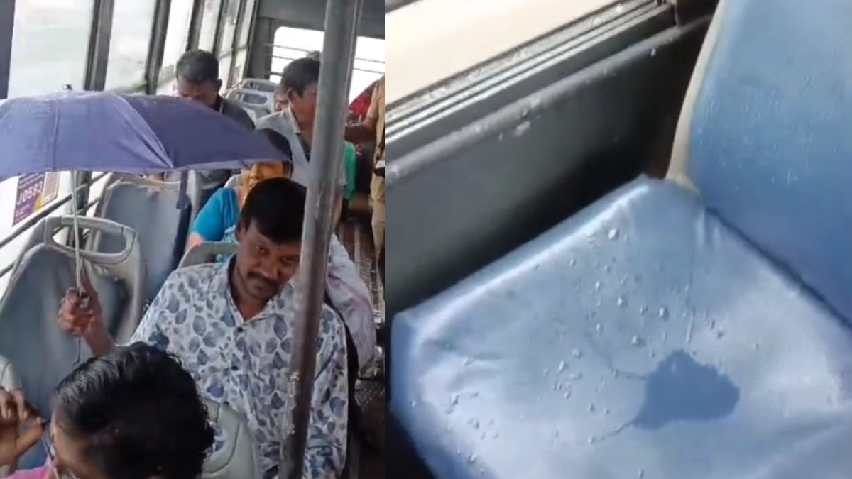 பேருந்தில் பயணித்த பயணி ஒருவர், குடை பிடித்தபடி அமர்ந்து பயணித்த வீடியோ காட்சி சமூக வலைதளத்தில் வைரல் ஆகி வருகிறது.