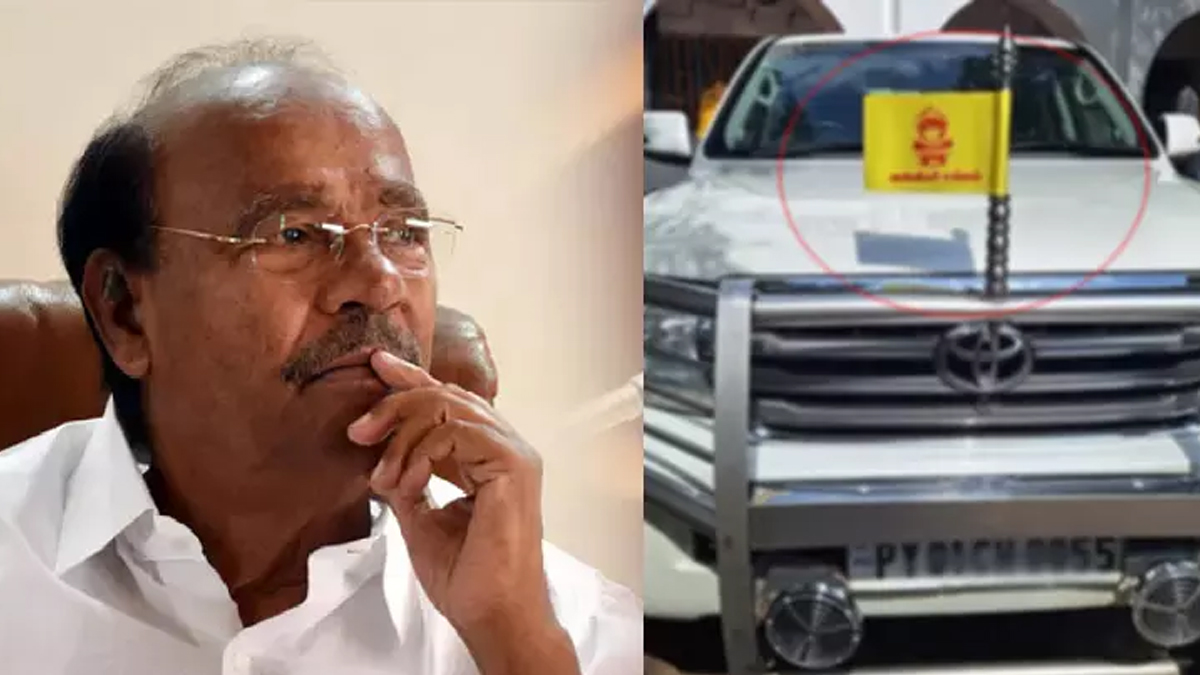 வன்னியர் இடஒதுக்கீட்டுக்கான போராட்டத்தில் உயிரிழந்த தியாகிகள் தினத்தை முன்னிட்டு, அவர்களுக்கு மரியாதை செலுத்தும் வகையில் வன்னியர் சங்க கொடியை காரில் பொருத்தியுள்ளார்.