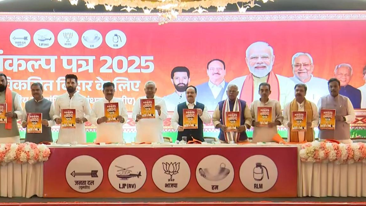 பீகார் மாநில சட்டமன்ற தேர்தல் நடைபெற உள்ள நிலையில் தேர்தல் அறிக்கையை தேசிய ஜனநாயகக் கூட்டணி இன்று வெளியிட்டது.