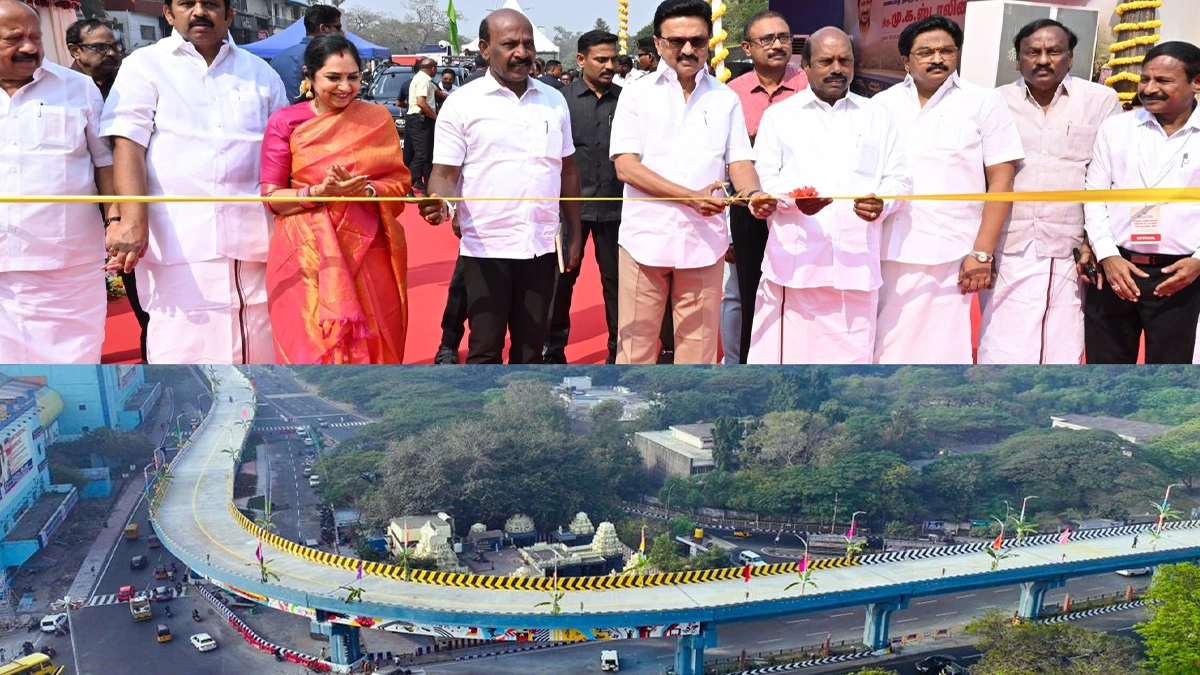 போக்குவரத்து நெரிசல் மிகுந்த இந்த சாலை சந்திப்பில் வாகனங்கள் சிரமமின்றி கடந்து செல்வதற்காக 60 கோடியே 68 லட்சம் ரூபாய் செலவில் எல் வடிவ மேம்பாலம் அமைக்கப்பட்டுள்ளது. இந்த மேம்பாலப் பணிகள் முடிந்த நிலையில், முதலமைச்சர் மு.க.ஸ்டாலின் மேம்பாலத்தை திறந்து வைத்தார்.