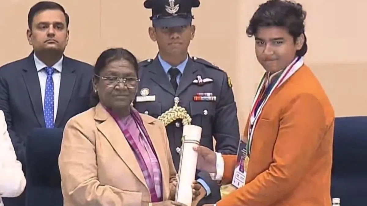 இளம் விளையாட்டு வீரர்களை கௌரவிக்கும் பிரதம மந்திரி ராஷ்ட்ரிய பால் புரஸ்கார் விருதை குடியரசுத் தலைவர் முர்முவிடம் இருந்து பெற்றார் 14 வயது கிரிக்கெட் வீரர் வைபவ் சூர்யவன்ஷி.
