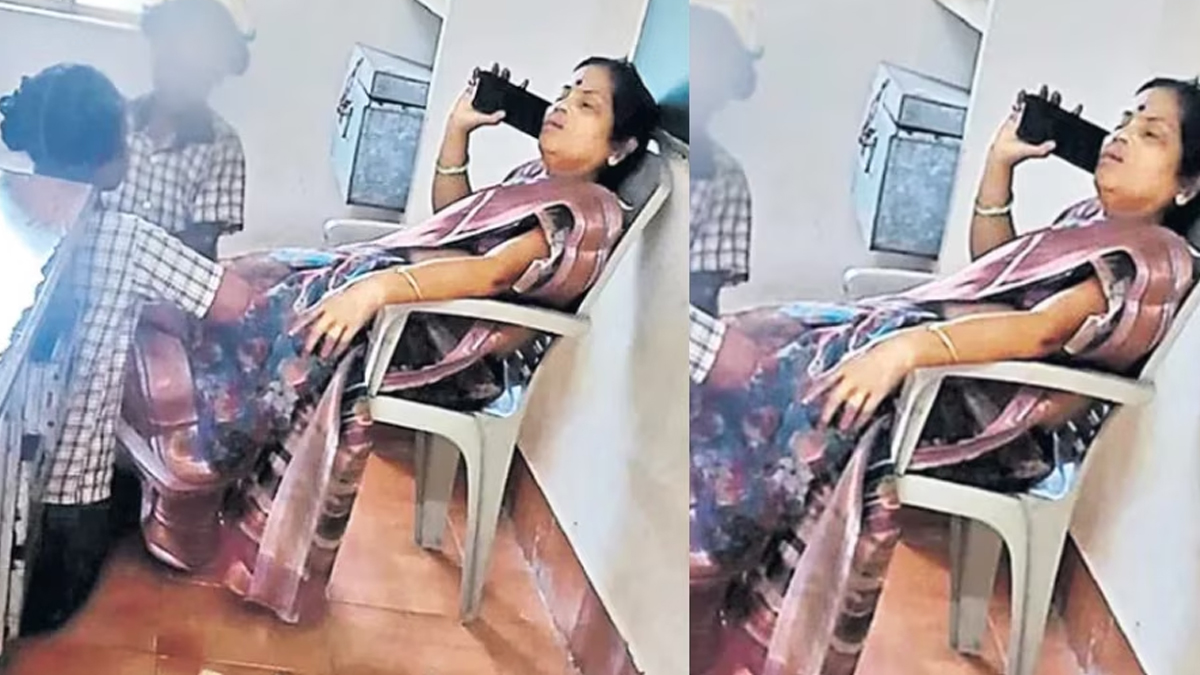 பாட நேரத்தில் ஆசிரியை ஒருவர் நாற்காலியில் அமர்ந்தபடி தொலைபேசியில் பேசிக்கொண்டிருக்க, மாணவிகள் அவருக்குக் கால்கள் பிடித்துவிடும் காட்சி சமூக வலைதளங்களில் வைரலாகி வருகிறது.